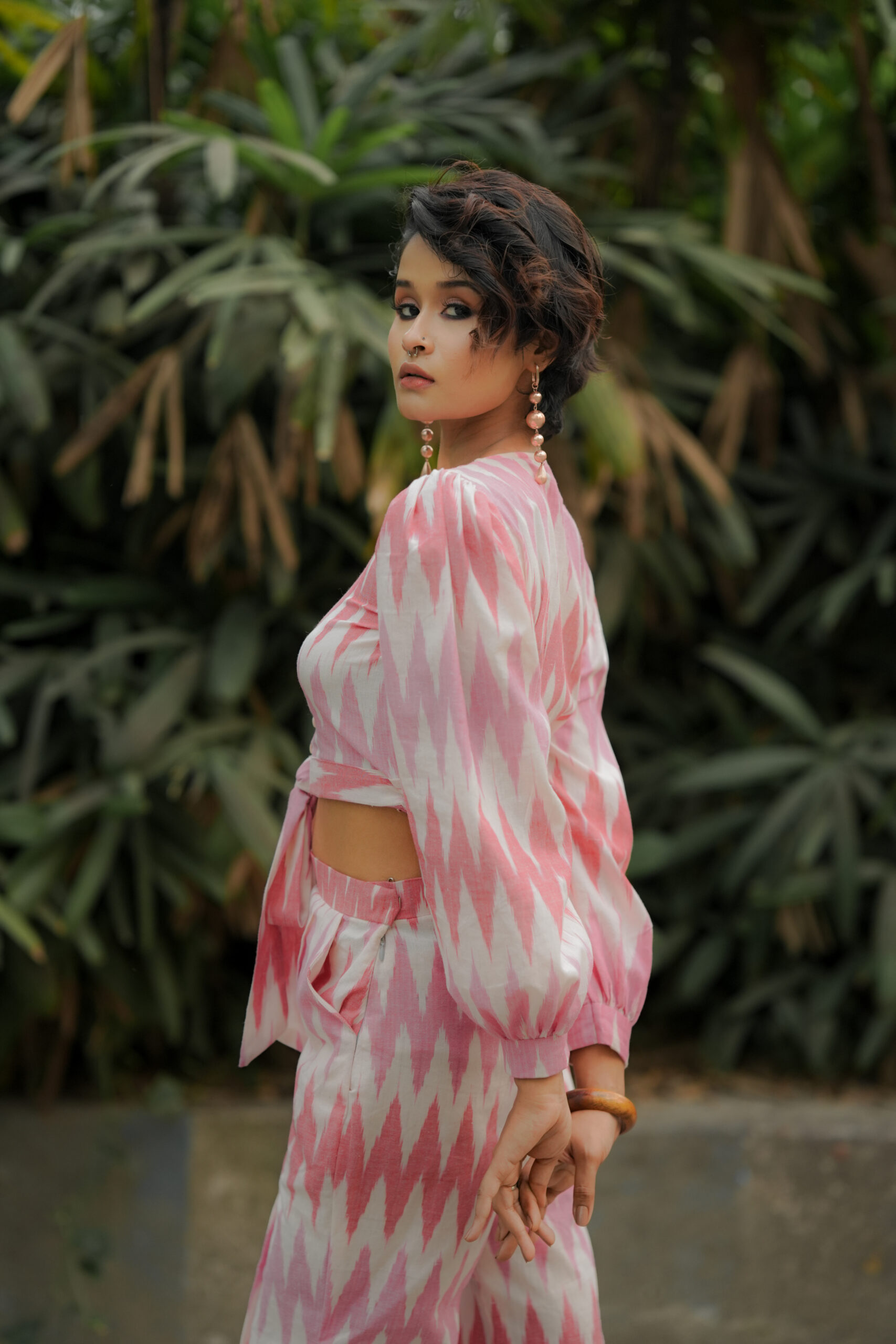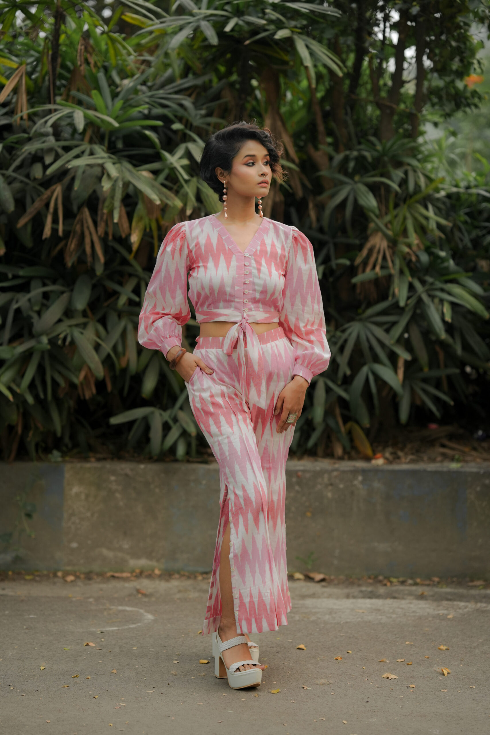 Step into contemporary chic with Kotha’s Crop Top Coord Set, a stylish ensemble designed for effortless sophistication. Featuring a front-knot crop top paired with sleek bottoms, this set is crafted from premium Ikat Handloom 3D fabric, blending heritage craftsmanship with modern design.